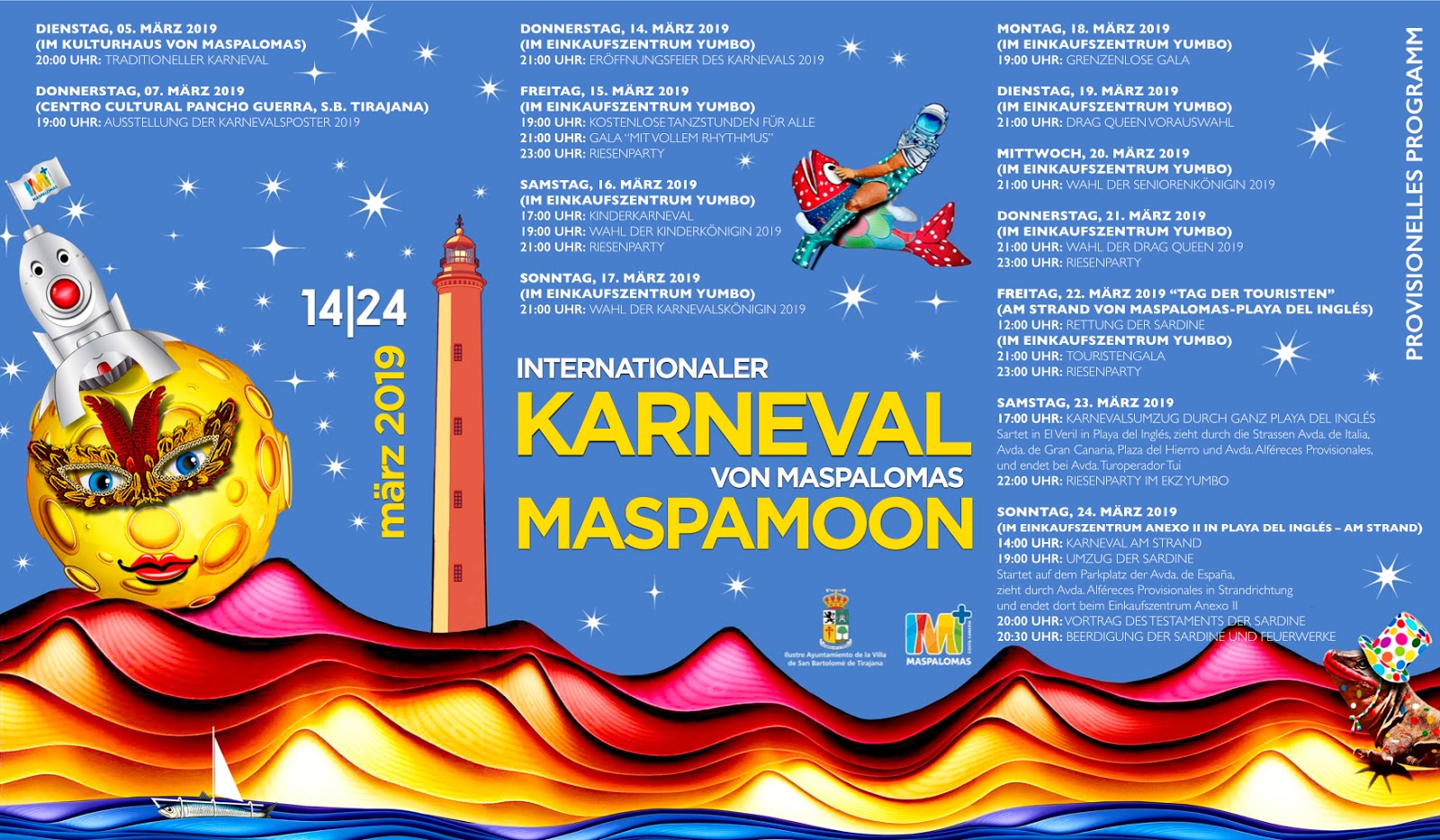 El cartel ganador de este año ha sido “Luna en Dunas”, una obra de Iñaki Fernández Iturmendi, una obra en la que se aprecian elementos como una gran Luna junto al cohete Apolo XI disfrazados sobre las Dunas de Maspalomas o a un drag queen astronauta volando sobre la Sardina del Carnaval dejando atrás al Faro de Maspalomas.